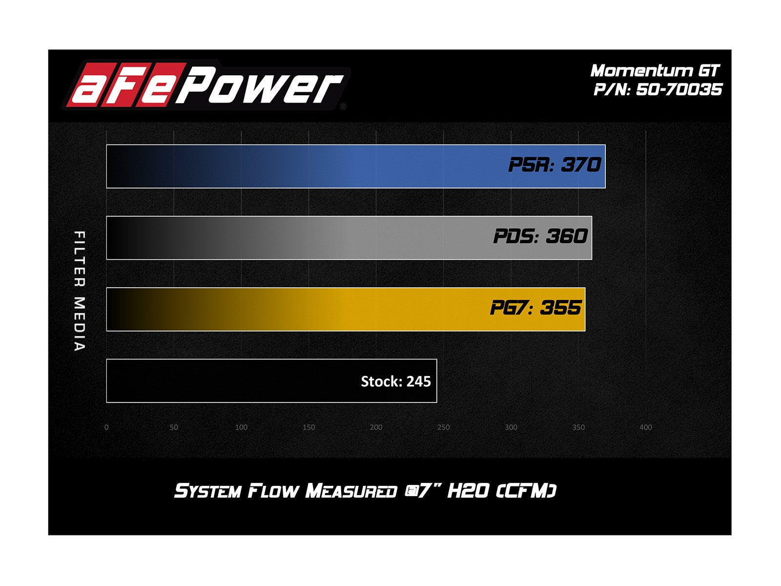 aFe uses their special high-flow conical air filters that allow the most possible air flow without letting in contaminants. Each intake produces a deep and throaty sound and outflows the factory intake by an average of 30%!