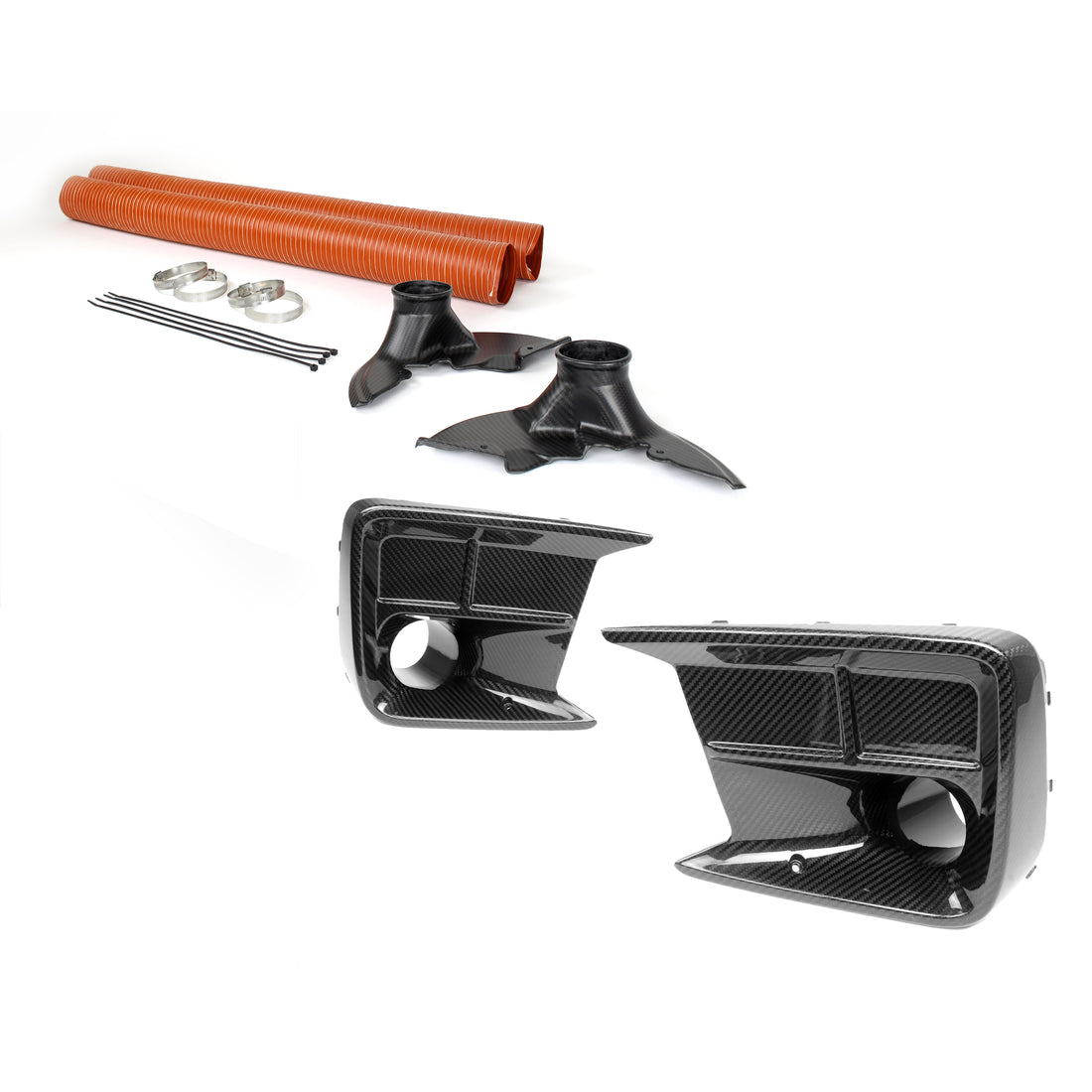 APR Performance introduces aerodynamically-optimized Brake Cooling Ducts designed to harness the venturi effect, funneling in substantial air to enhance pressure and velocity. As vehicle speed rises, this design facilitates the passage of air from a larger frontal area to a smaller brake duct pipe section. Coupled with high-temperature air duct hoses, APR Brake Cooling Ducts efficiently channel large volumes of fresh air, ensuring consistent cooling of brake rotors during intense track sessions. Guarding against excessive heat, these ducts play a vital role in preventing costly damage to crucial car components, such as engine bays, radiators, brakes, transmissions, and differentials. Crafted from pre-preg carbon fiber reinforced polymer (CFRP) composite materials, APR Air Ducts combine superior strength with lightweight functionality, strategically delivering cooling air where needed most.