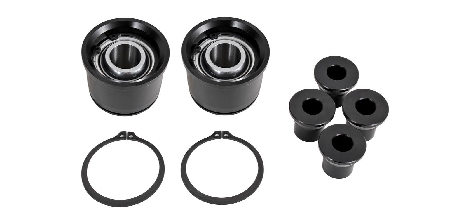 Minimize wheelhop and enhance the rear stability of your 2015 and newer S550 Mustang by eliminating rear lower control arm bushing deflection with a set of Lower Control Arm Spherical Bearings from BMR Suspension. The stock rubber bushings are great for absorbing NVH, but do little for performance. The large spherical bearings in BMR's rear Lower Control Arm Spherical Bearing Kit simply eliminate bushing deflection, transferring power instead of absorbing it. BMR Suspension's rear Lower Control Arm Spherical Bushings (BK055) drastically decreases lower control arm movement by eliminating deflection of the factory rubber bushings. Weighing in at over 3/4lb - the 1-inch Bearing in this BK055 is the largest 1-inch bearing in the industry. Others who claim this, are misleading the consumer. This 1-inch bearing has a center ball diameter of over 1.8 inches and is load rated at an incredible 90,000lbs! BMR uses heavy-duty 1-inch spherical bearings in machined bearing cups to replace the factory rubber bushings. The cup and bearing press into the lower control arm and are held in place with heavy-duty snap rings. CNC-machined billet aluminum spacers complete the assembly. This allows for a perfect fit and increased performance for any driving style.