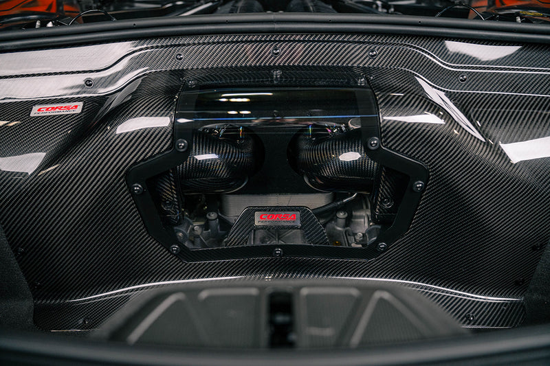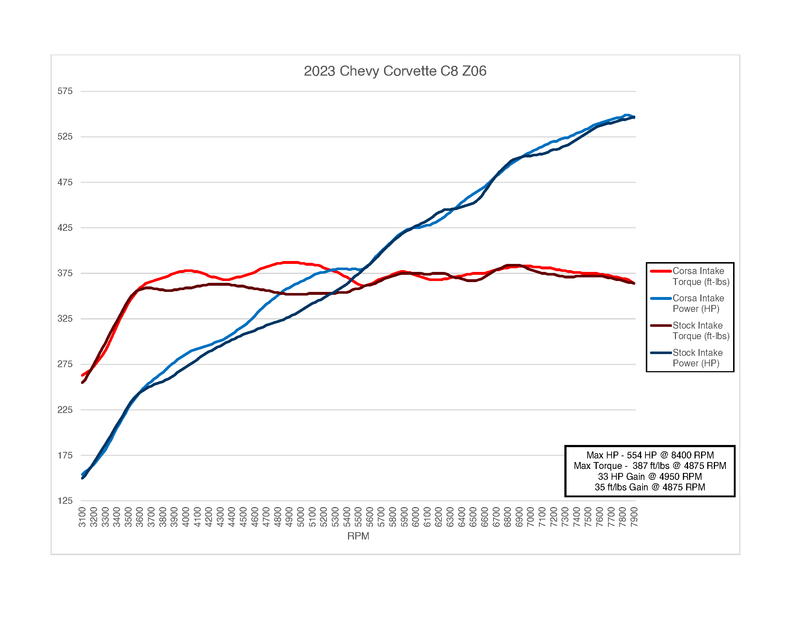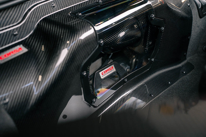 The CORSA Performance Air Intake for the C8 Z06 Corvette is a true dual-path system. It blends bold aesthetics with precision engineering to maximize performance. Compared to the stock intake, the optimized duct shape, refined air box design, and high-performance filtration deliver increased power and improved fuel efficiency. Dyno-tuned for optimal results, this carbon fiber intake produces up to +33 horsepower at 4950 RPM and +35 ft-lbs of torque at 4875 RPM on the LT6 5.5L naturally aspirated flat-plane crank V8—no tune required.