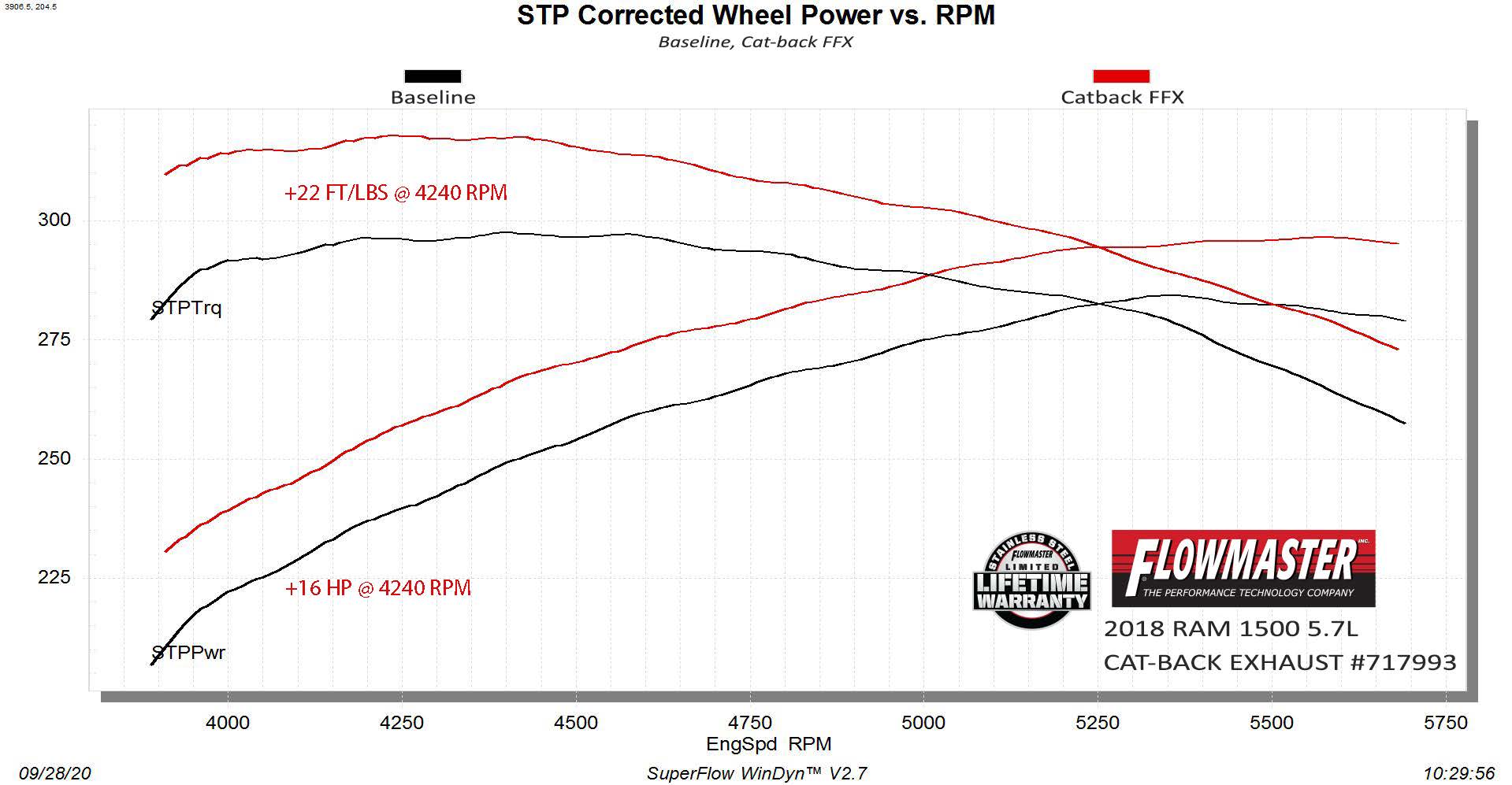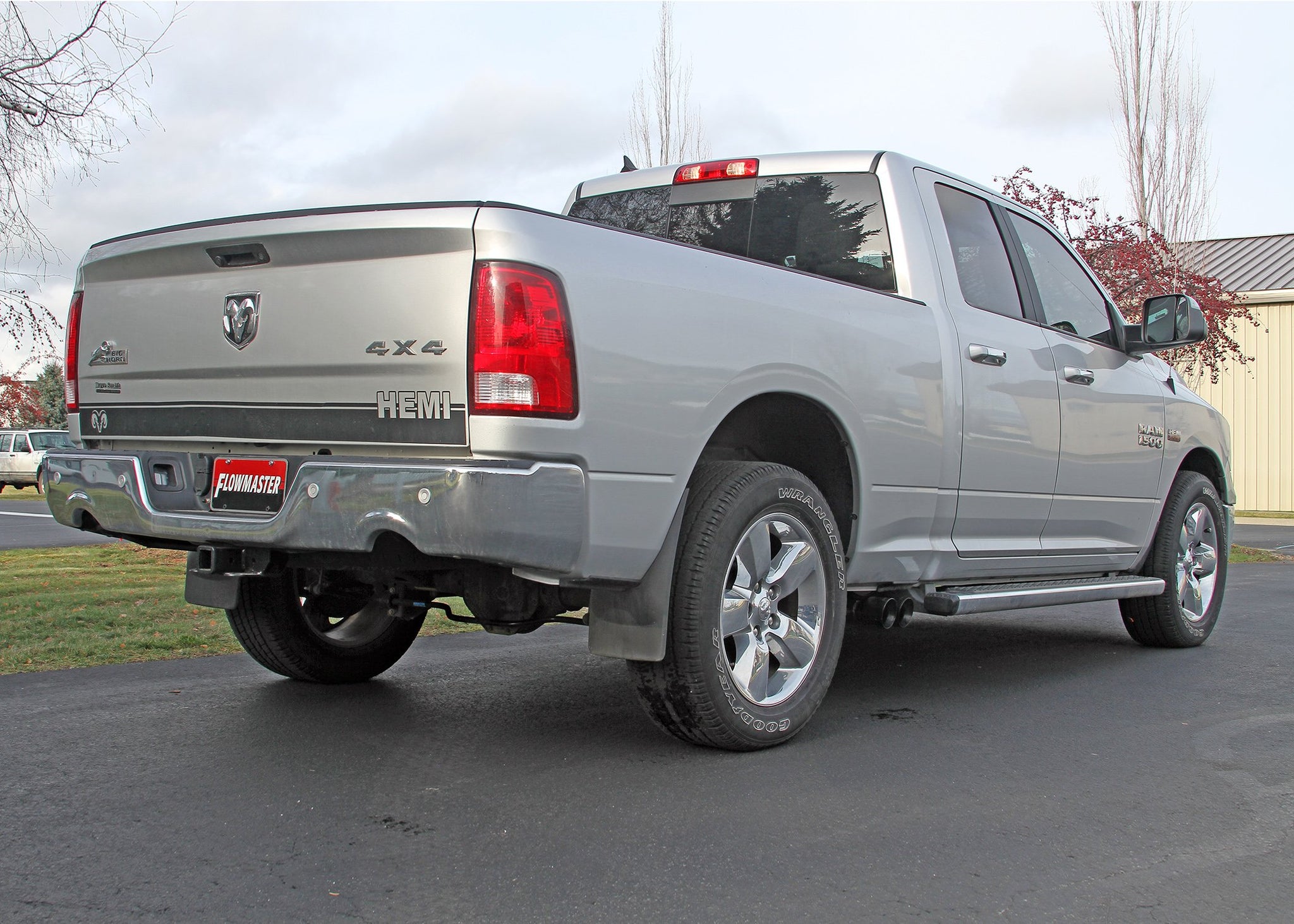 This Flowmaster® Flow FX® cat-back exhaust system for the 2009-2023 Dodge RAM 1500 trucks (19-23 1500 Classic only) with the 4.7 or 5.7-liter engine is manufactured using durable 409 stainless steel throughout and features 3.00 to dual 2.50-inch mandrel bent pipes for better exhaust gas flow. A Flow FX "straight-through" muffler is used for an aggressive to moderate sound level and maximum performance. Maximum increases on the dyno revealed +16 hp and +22 lb-ft at the rear wheels. This system exits out the same side, in front of the rear wheel on the passenger with dual 4.00-inch black ceramic tips for added style and a custom look. The system uses all the existing factory hanger locations and includes installation instructions and all necessary hardware for an easy installation that you can do at home. Backed by Flowmaster's Lifetime Limited Warranty.