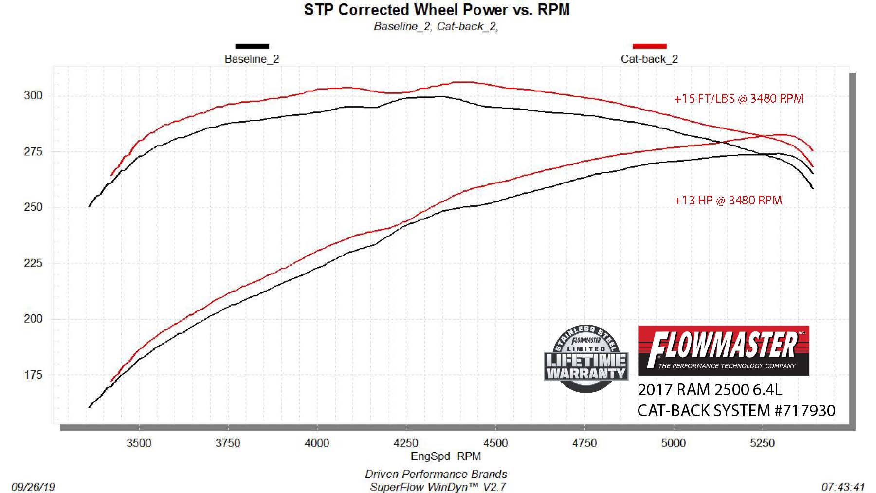 - Max increases of up to 13 hp and 15 lb-ft over the stock exhaust at the rear wheels