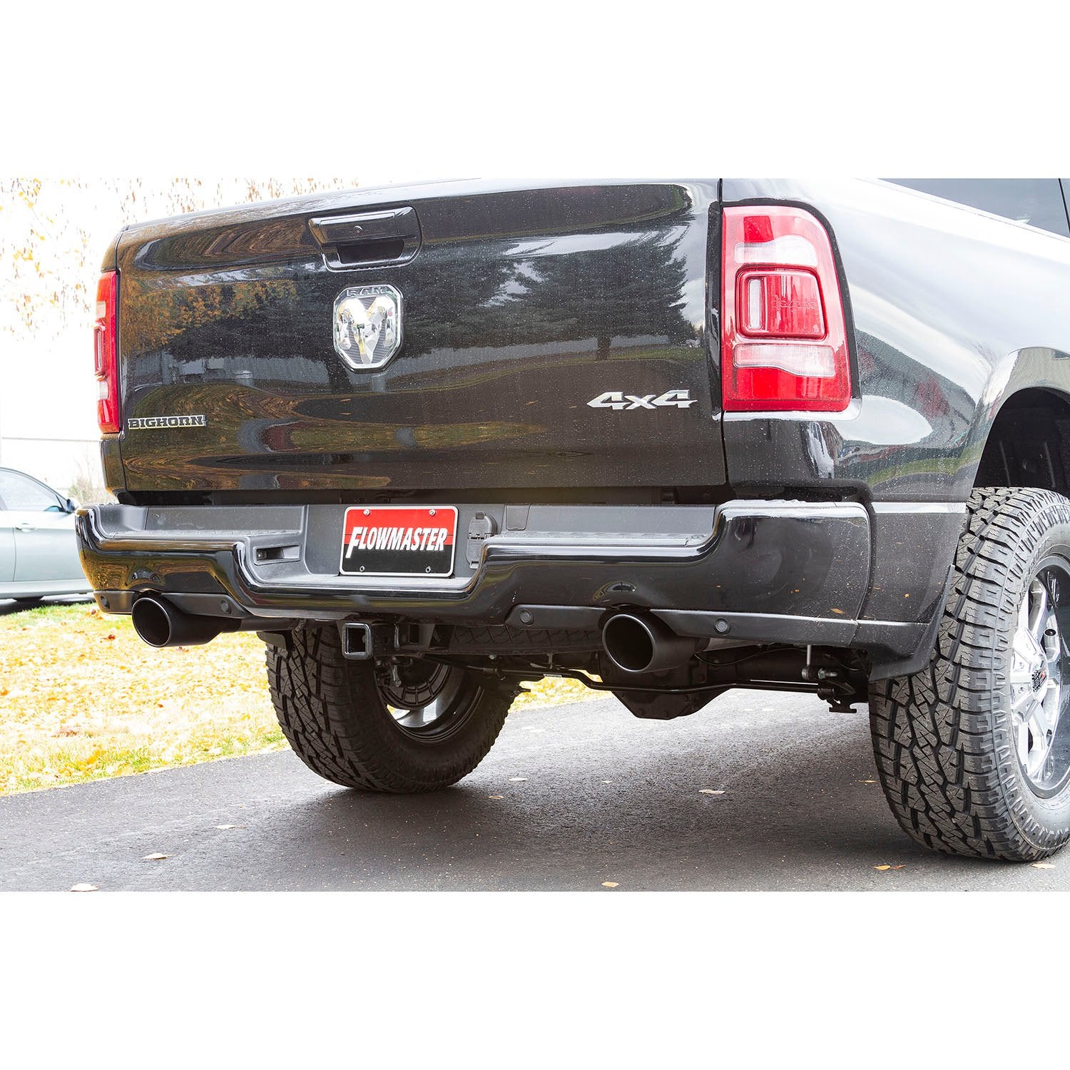 Our new Flow FX® cat-back exhaust system is designed specifically for the 2019-2024 RAM truck (new body) with 5.7L Hemi and factory dual exhaust. Features include full stainless steel construction, large 3.00-inch flanged inlet pipe flowing in the single inlet/dual outlet Flow FX "straight-through" muffler for great sound and maximum performance. The dual 2.50-inch mandrel bent tailpipes clear the factory hitch and spare tire and exit out through the factory rear bumper cutouts with large 4.50-inch diameter black ceramic coated 304S stainless steel tips giving your RAM that custom look that goes hand in hand with that deep performance Flow FX sound. The system uses all the factory hanger locations and connections without any cutting or welding for an easy installation that you can do at home. Includes installation instructions and all necessary hardware. Note: This system fits all wheelbases, both two and four wheel drive models along with all cab and bed configurations.