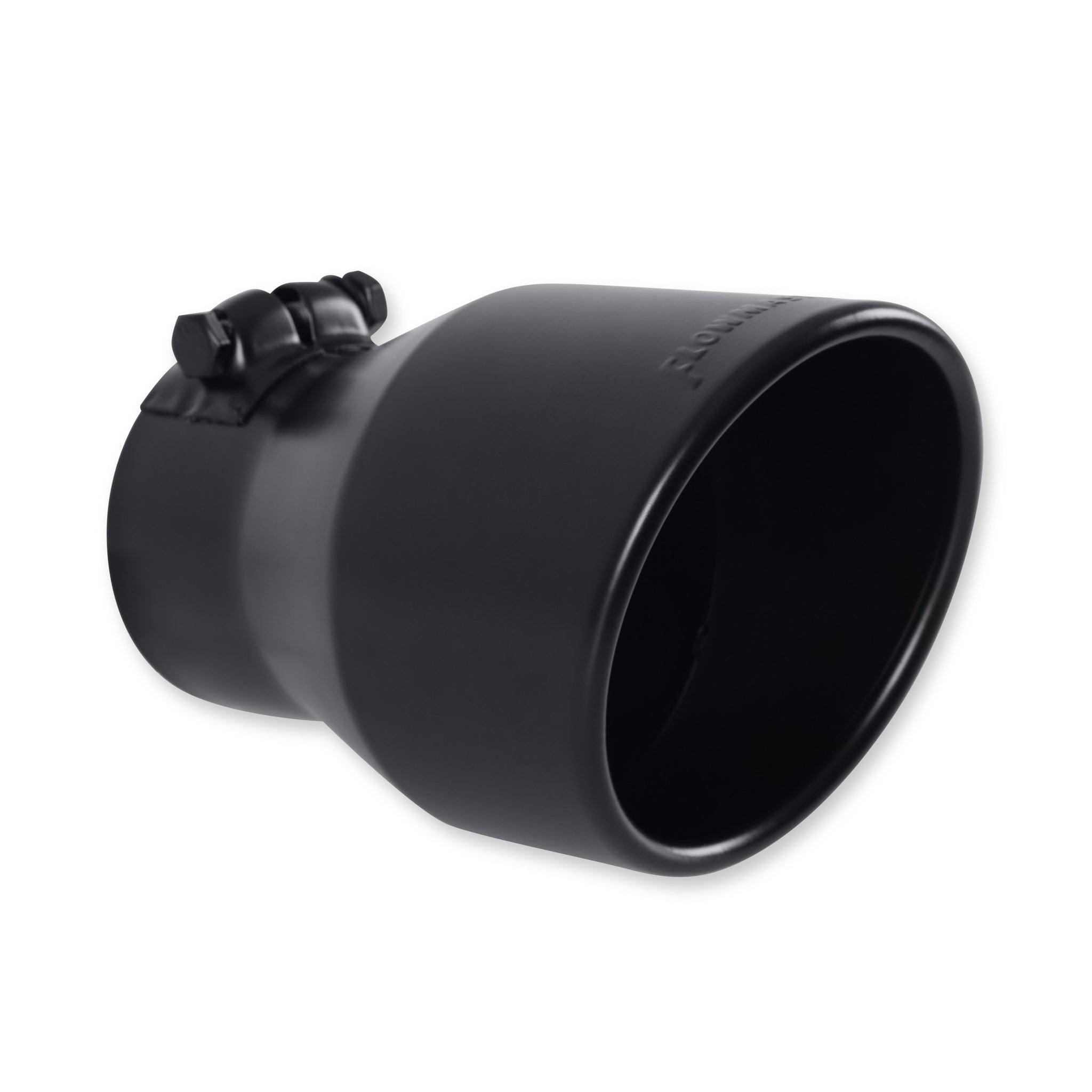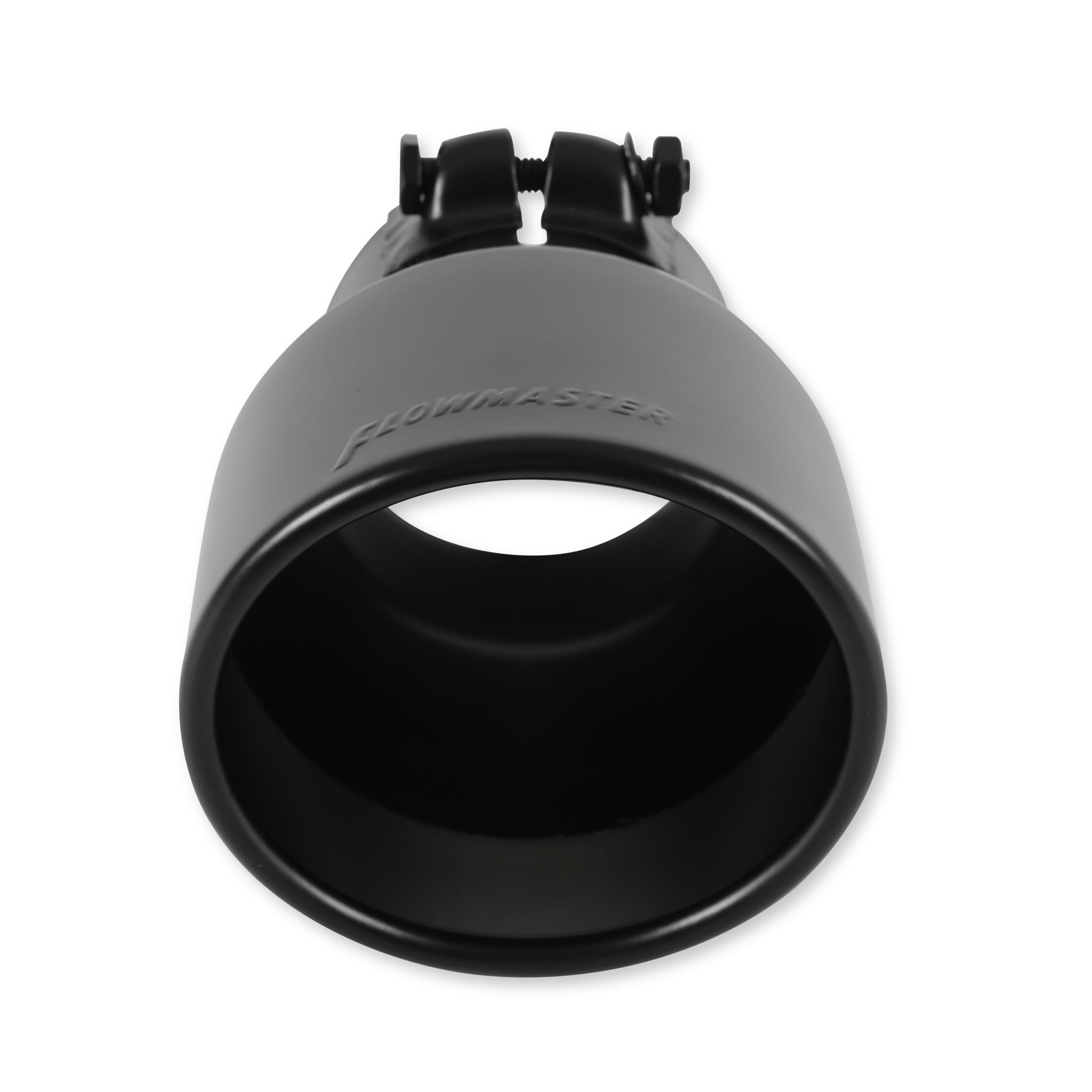 his black ceramic coated tip is a great way to customize your vehicle. Designed for 3.00-inch tailpipes, this 4.500-inch tip is 7.00-inches long, has an angled rolled edge and is finished off with the Flowmaster logo embossed at the end of the tip. This is a clamp on style tip to allow for an easy installation with basic hand tools. Backed by Flowmaster's three year Limited Warranty.