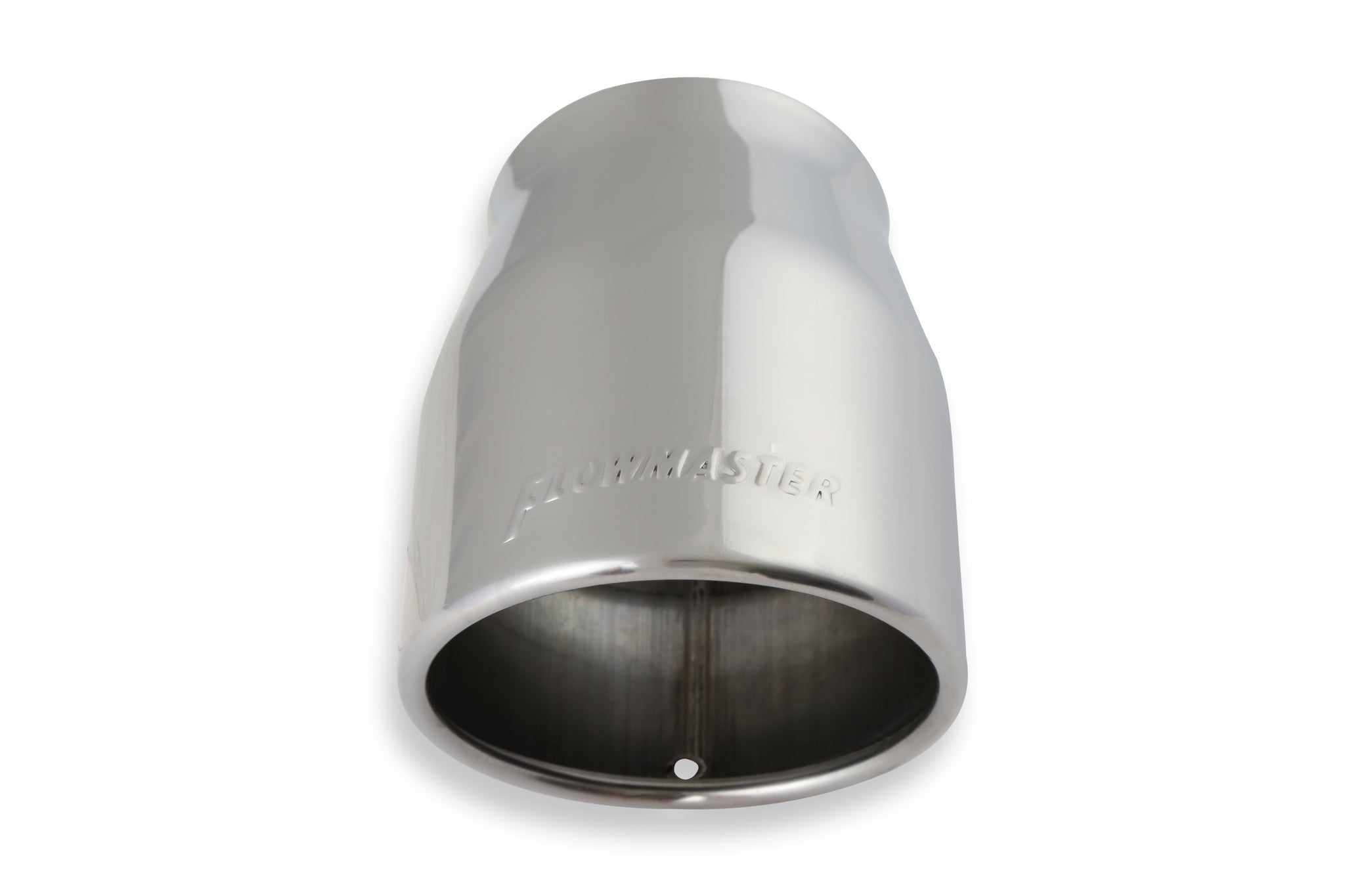 Polished stainless steel tip features weld-on mounting design for custom applications. Slips over 3.00 in. pipe and outer diameter measures 4.00 in. with angled, rolled edge and embossed Flowmaster logo.