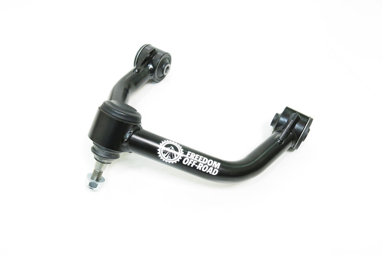 Front Upper Non-Adjustable A-Arms for 2"-4" Lifted Vehicles by Freedom Off-Road. Quantity: 2 per Pack. Freedom Off-Road control arms are designed to provide superior strength over factory while correcting ball joint angle and castor. Replaceable heavy duty OE style fixed position greaseable ball joints and hardened rubber bushings provide a responsive ride feel. Purchase this premium Freedom Off-Road product known for its exceptional quality, outstanding durability and superior efficiency as well as seamless performance.