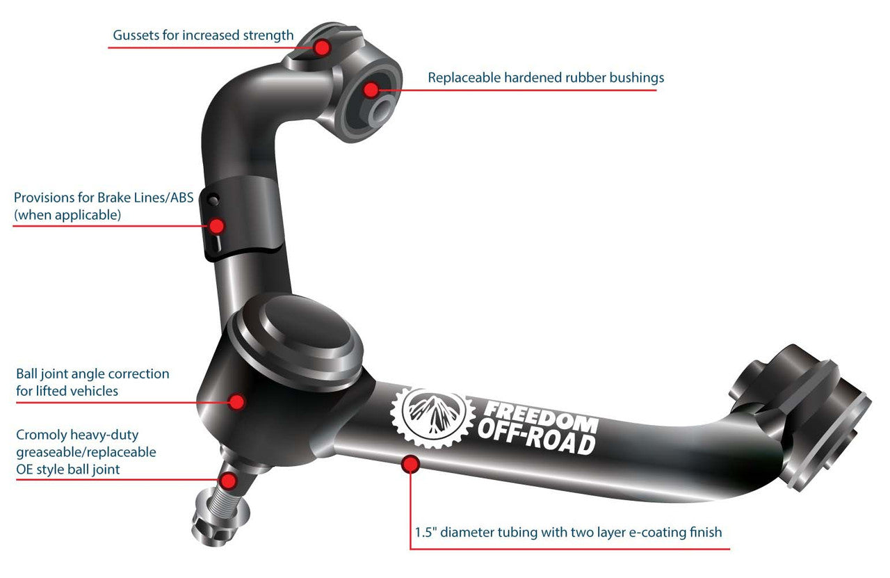 Front Upper Non-Adjustable A-Arms for 2"-3" Lifted Vehicles by Freedom Off-Road®. Quantity: 2 per Pack. Freedom Off-Road control arms are designed to provide superior strength over factory while correcting ball joint angle and castor. Replaceable heavy duty OE style fixed position greaseable ball joints and hardened rubber bushings provide a responsive ride feel. Purchase this premium Freedom Off-Road product known for its exceptional quality, outstanding durability and superior efficiency as well as seamless performance.