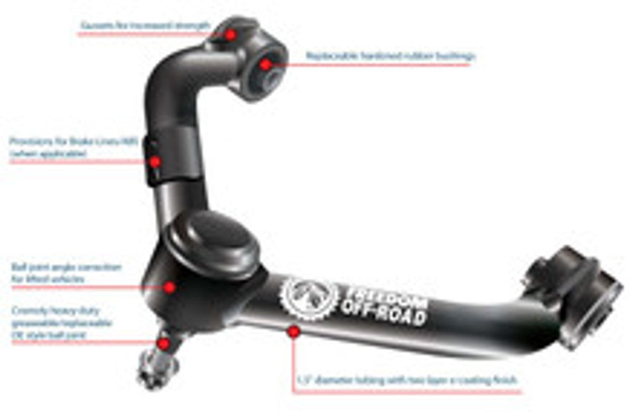 Front Upper Non-Adjustable A-Arms for 2"-4" Lifted Vehicles by Freedom Off-Road®. Quantity: 2 per Pack. Freedom Off-Road control arms are designed to provide superior strength over factory while correcting ball joint angle and castor. Replaceable heavy duty OE style fixed position greaseable ball joints and hardened rubber bushings provide a responsive ride feel. Purchase this premium Freedom Off-Road product known for its exceptional quality, outstanding durability and superior efficiency as well as seamless performance.