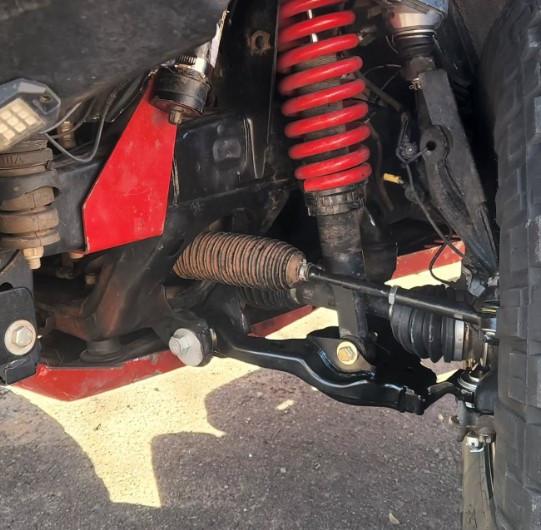 - Replacement front lower control arms and cam bolts (+/- 1.5° camber and caster adjustment)