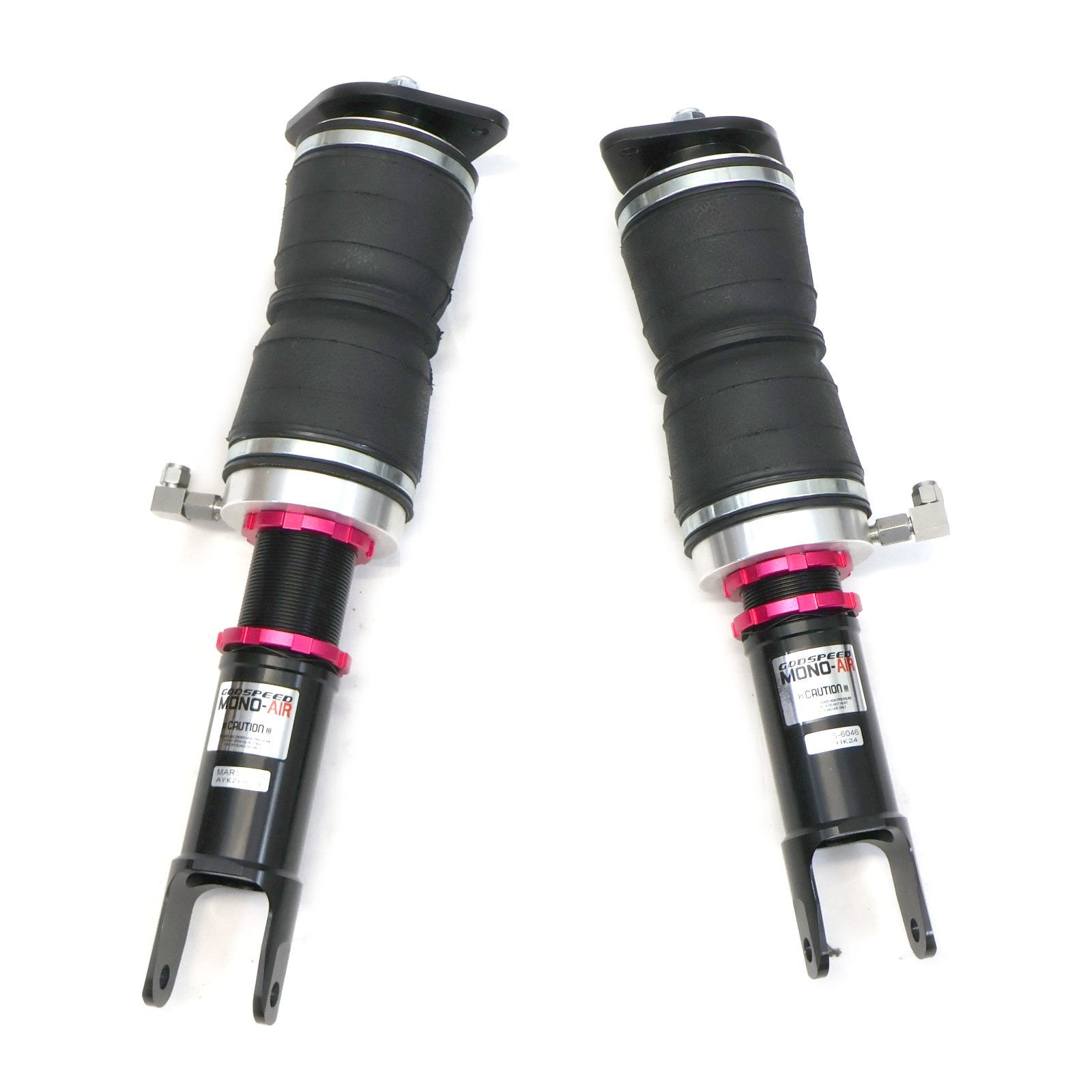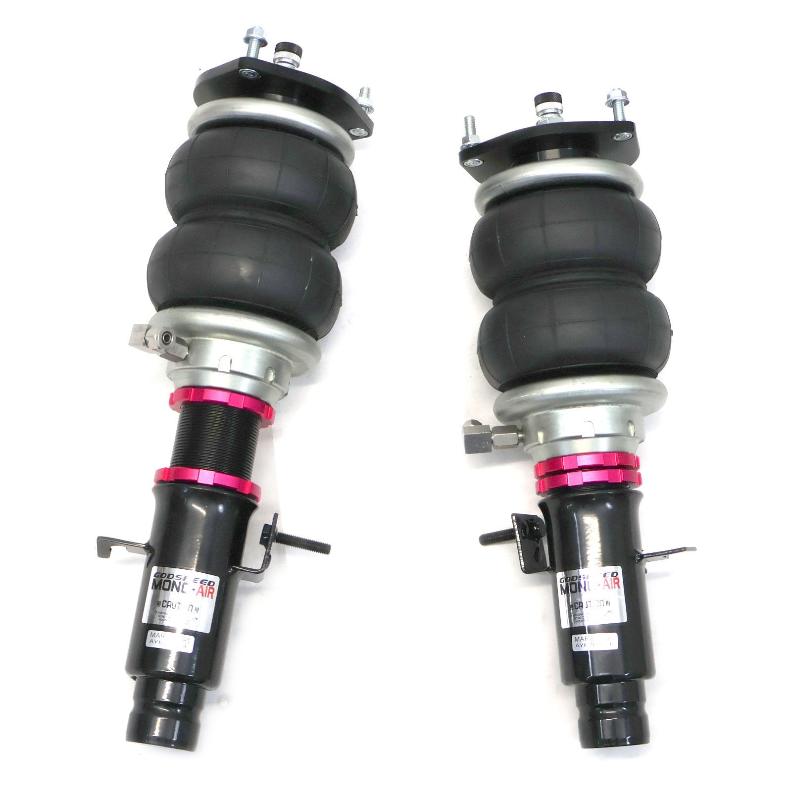 Godspeed Project's Mono-AIR Suspension Strut Kit includes both front and rear struts that works with most air management system out in the market. Mono-AIR features mono-tube shock with 32 stages of rebound damping adjustments that allows you to control suspension return to proper position rapidly or slowly depends on driving condition. High quality rubber air bags are used in replace of springs that allows easy ride height adjustment, stainless steel fittings included. Due to the importance of rubber air bag role in the suspensions kit, high quality rubber material are used to withstand from drying out and cracking result in longer life when compared to cheap rubber material. Godspeed air struts are designed to be easy installation that should requires no modifications to your car or parts.