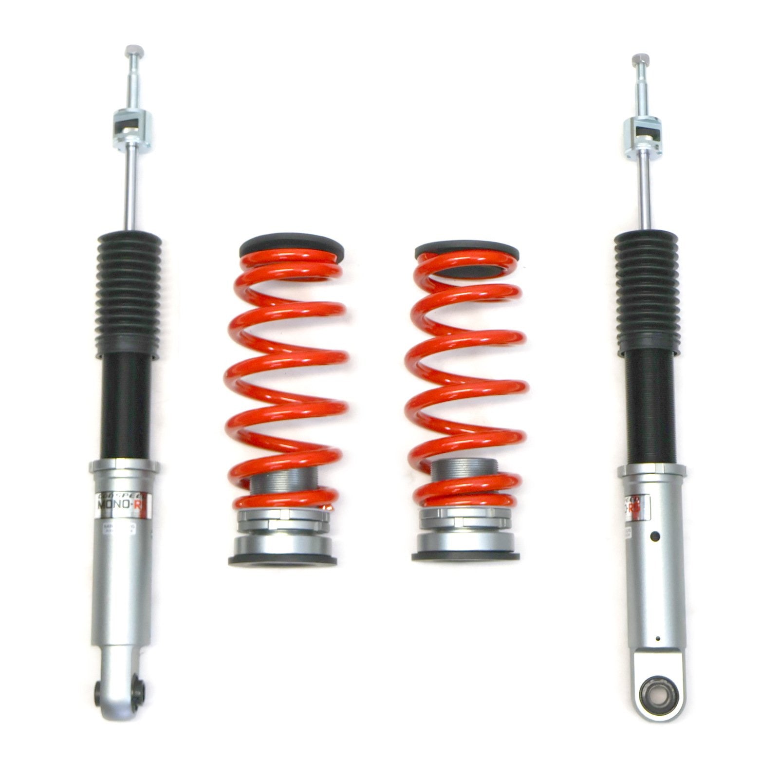 MonoRS Coilover damper kit by Godspeed Project are an intermediate suspension upgrade setup for daily and Sunday club racing. Lowering your car with improved springs over factory and paired with Monotube shocks with valving that allows 32 levels of rebound adjustment to improve handling without sacrifice comfort. Ride height can easily be adjusted by twisting the lower mount bracket. In order to keep weight gain at the minimum, most of attachments and accessories are CNC machined from billet aluminum. Koyo bearings are used when camber plate top mount is applicable depends on car models. To assure that our customers are getting high quality products, MonoRS coilovers are covered by 12 months limited warranty by the manufacturer from top to bottom just like other big brand name setups.