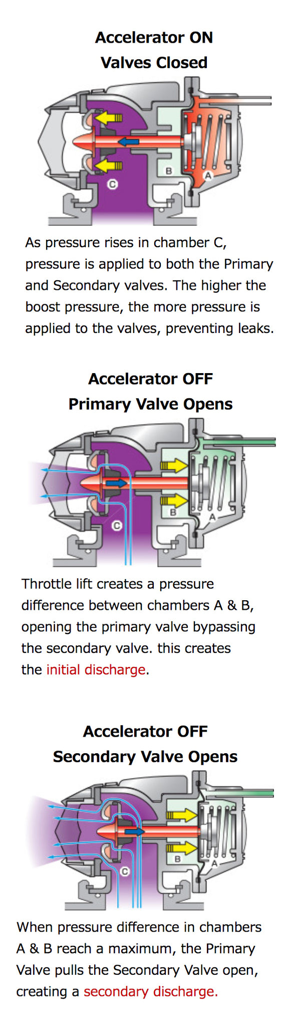 - Instantly opens when the throttle is lifted, rapidly releasing initial excess boost pressure.