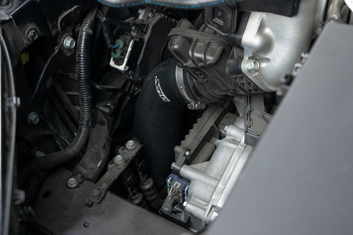 - Custom 2-3/8" hot side high temp reinforced silicone charge hose.