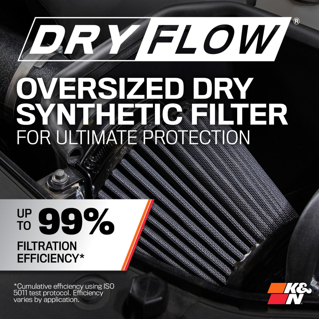 The K&N DRYFLOW Air Intake System is a high-performance upgrade designed to replace the restrictive factory air filter and intake housing in your vehicle. This system improves airflow by reducing intake restrictions and straightening air paths, allowing the engine to breathe better. With increased airflow, the engine gains more usable power and acceleration across the RPM range. Equipped with an oil-free synthetic filter media, the DRYFLOW system enhances engine protection and airflow without the need for oil. This means smoother, cooler, and denser air is funneled directly through a custom intake tube to the throttle body, ensuring a noticeable power boost.