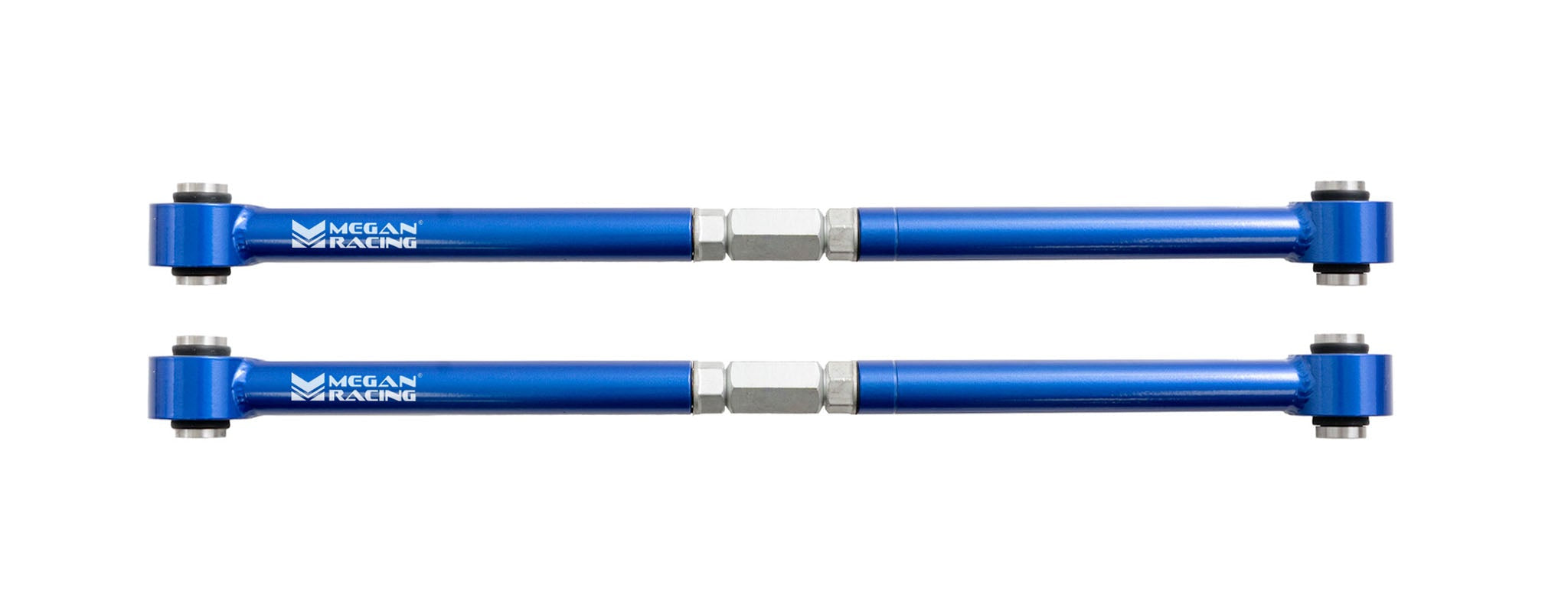 Megan Racing control arms are constructed of a Lightweight Steel-Alloy which is able to withstand the stresses of extreme competition these arms are powder coated with a 3-Stage process to ensure durability and protection against the elements. Incorporated turnbuckle style adjustability allows for fine tuning of the vehicle’s rear camber angles while spherical bushings help eliminate suspension slop over the soft (and tired) factory bushings increasing vehicle dynamic response while still insulating the majority of absorbed road noises. All hardware is treated to help prevent corrosion during the harshest weather conditions and are protected with a 1-year warranty against manufacturer defects.