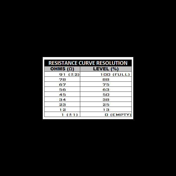 - Resistance: 0 (Empty)-90 (Full) Ohms