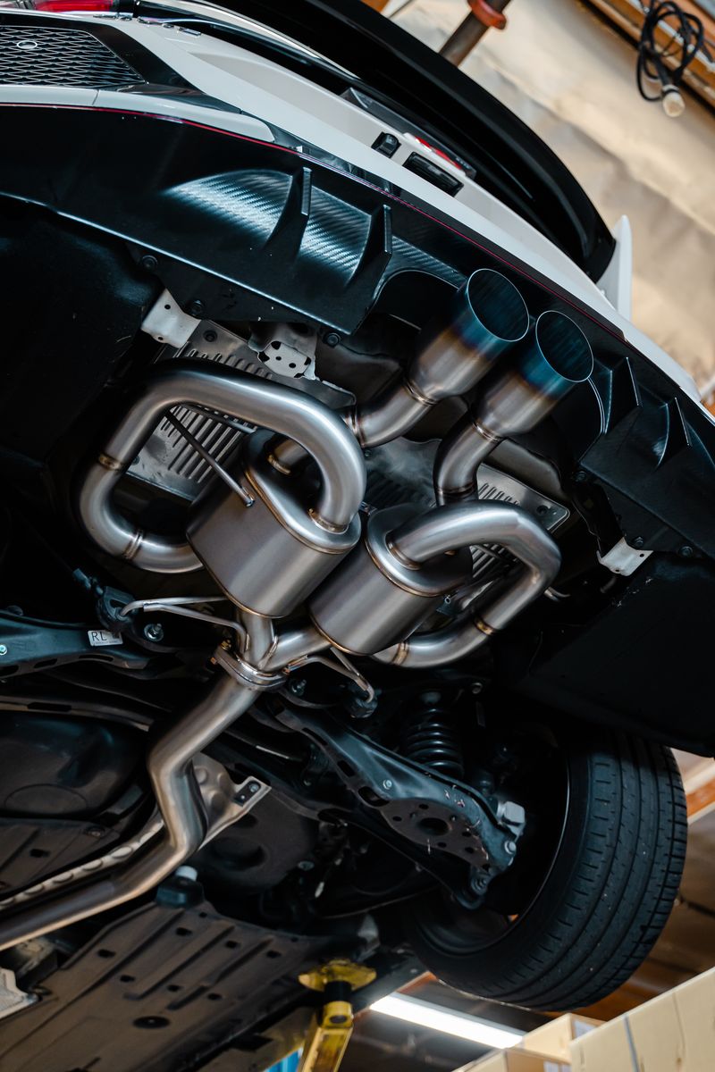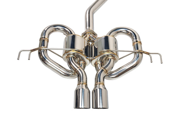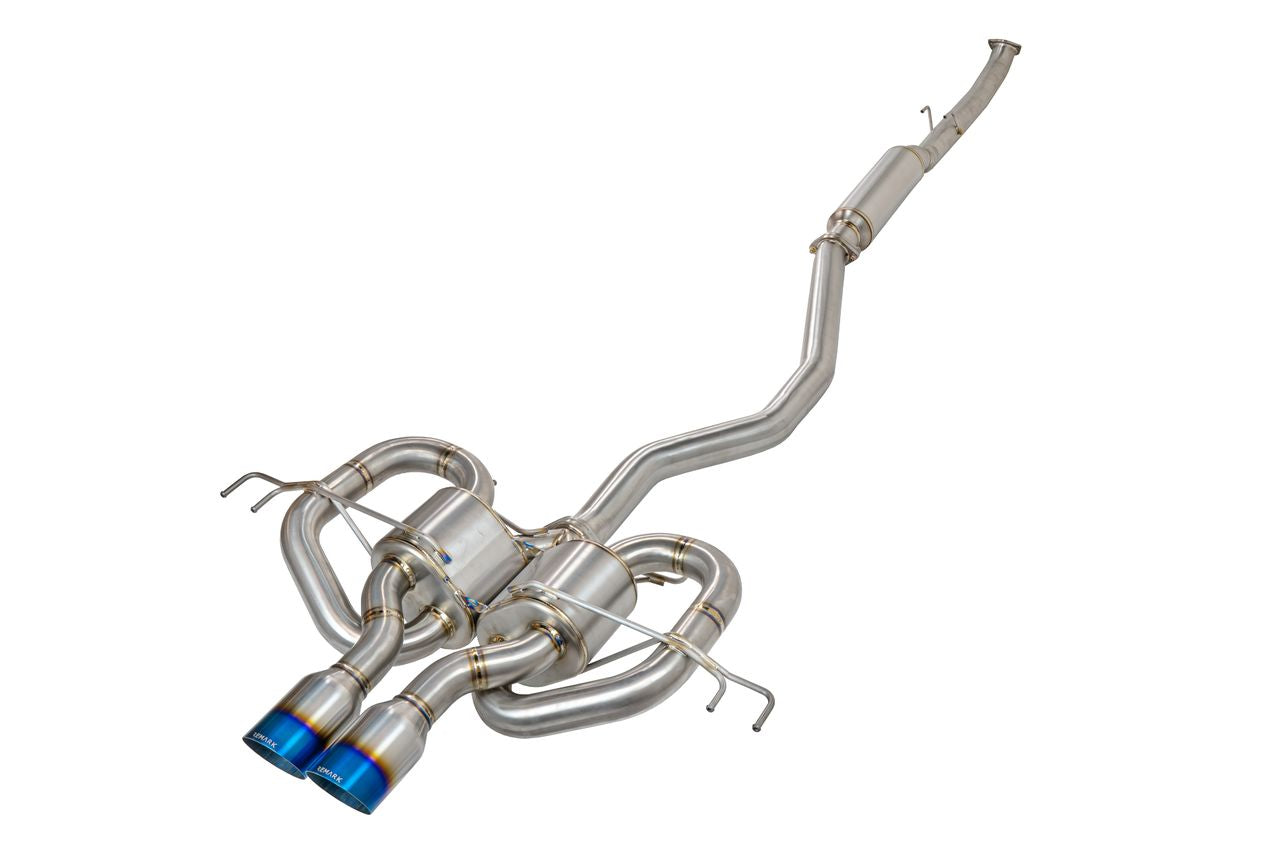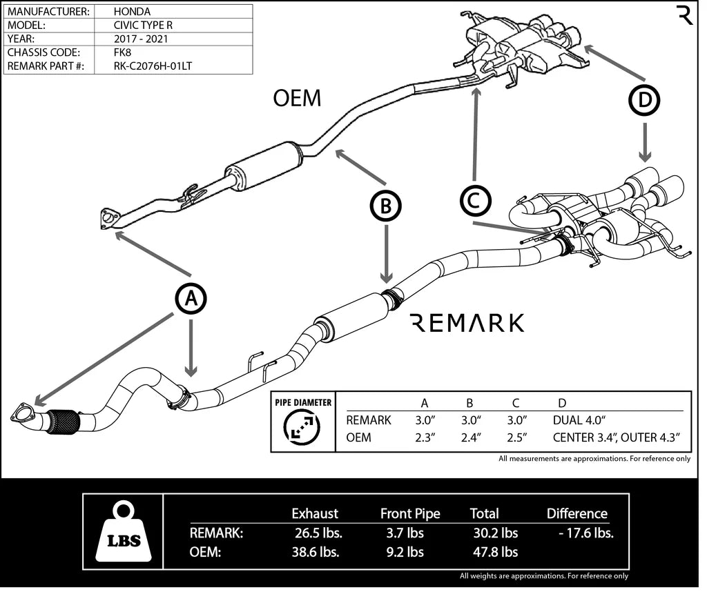 Remark's FK8 exhaust is the ultimate choice, combining performance and quality in one package. Made from full GR2 high-grade titanium, this exhaust system is over 17 lbs lighter than the factory version and features a 20% larger diameter. Its straight-through resonator design and dual high-flow muffler canisters minimize back pressure while controlling sound. The innovative Link Loop design effectively reduces drone, a common issue in heavily modified engines with high-flow downpipes. The system boasts full 3" mandrel-bent tubing with smooth radii to ensure minimal restriction, and it's fully TIG welded by expert craftsmen in Remark's own factory, ensuring top-notch quality control. The exhaust includes a 3" front over-pipe, creating a true cat-back system with no reducers or neck-down sections to impede exhaust flow. Designed for ultimate street performance, this premium exhaust system offers a perfect balance between power and reduced noise, making it ideal for street use. Note: It is not compatible with the OEM front pipe, which can't accommodate a true 3" flange.