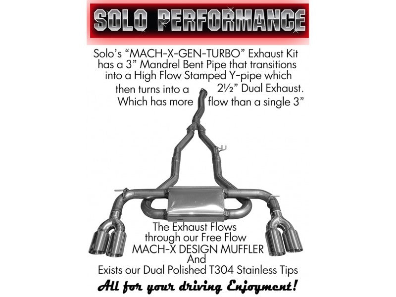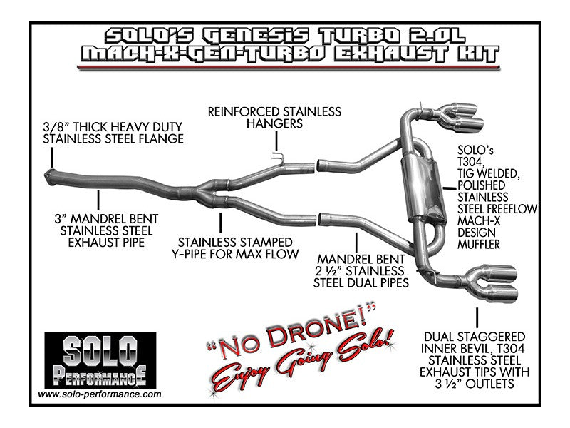 All of us at Solo Performance are excited to bring our “ Mach-X-Gen-Turbo” converter back exhaust kit to the Turbo Genesis community. This is a stainless steel, mandrel bent free flow, 3” exhaust kit that makes your Genesis sound as good as it looks. This no drone exhaust kit has a deep, rich, raw smooth tone that sounds incredible on the outside, while being non-invasive on the inside. Acceleration and downshifting has a rich deep sound with no trouble RPM ranges that are usually associated with 4 cylinders. Once you get up to cruise speed on the highway the system becomes almost stock quiet. Increased throttle response and the increased performance is felt from the very first drive. Attention to detail and a painstaking R&D process has brought you this stainless steel cat-back exhaust kit.