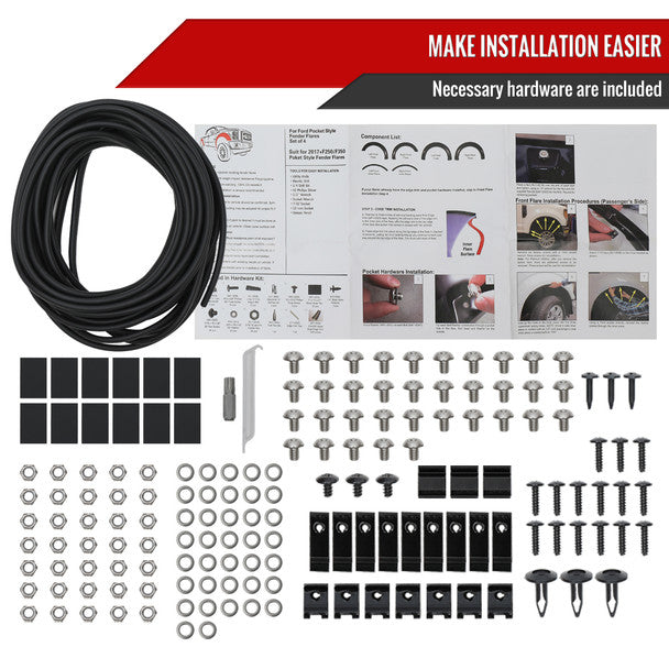 - All essential screws, bolts, clips, rivets, a Torx bit, edge trims, an edge trim tool, and an installation instruction manual are included