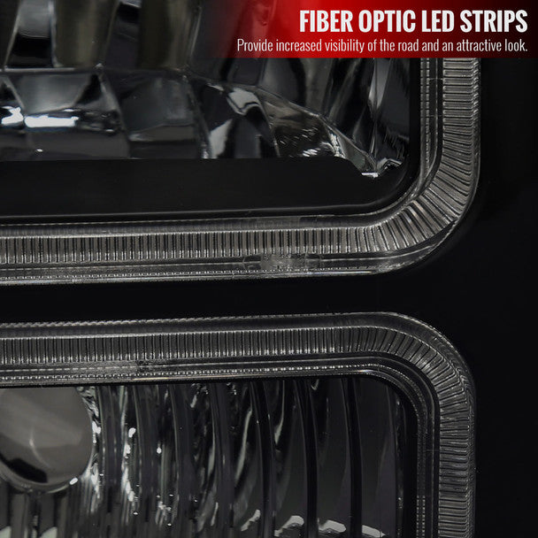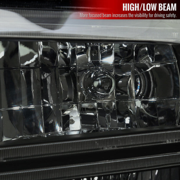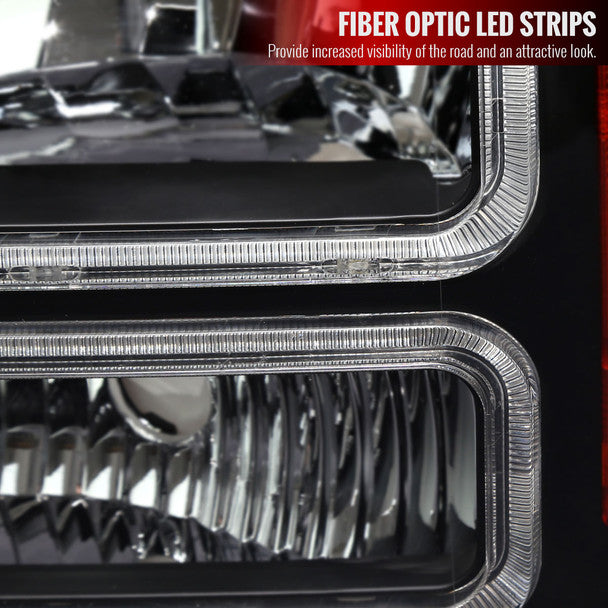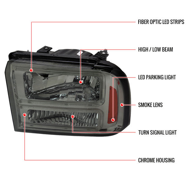 - Comes with (1) pair of factory style headlights with dual LED C-Bar in a chrome housing with clear lens / chrome housing with smoked lens / matte black housing with clear lens / matte black housing with smoked lens