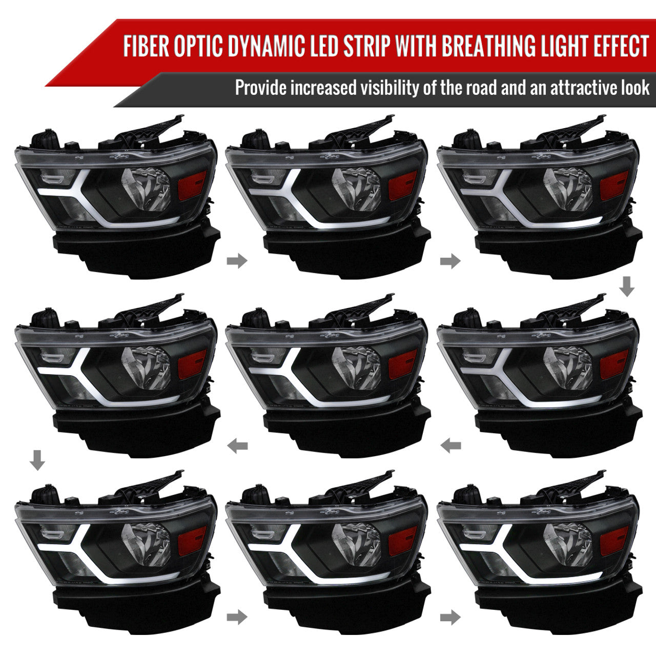 Ready to give your 2019-2024 Dodge RAM 1500 a major style upgrade? These Factory Style LED Bar Headlights with Amber Reflectors and Animated Fiber Optic Light Strips are the perfect choice! With sleek matte black housing, clear lenses, and cutting-edge LED technology, these headlights are sure to make your truck stand out on any road. Whether you’re looking for a bold aesthetic or enhanced safety features, these headlights are the perfect addition to your RAM.