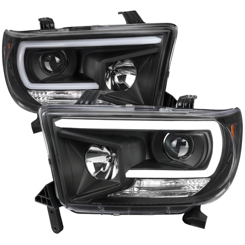 - 1 pair of black housing clear lens projector headlights with LED light bar