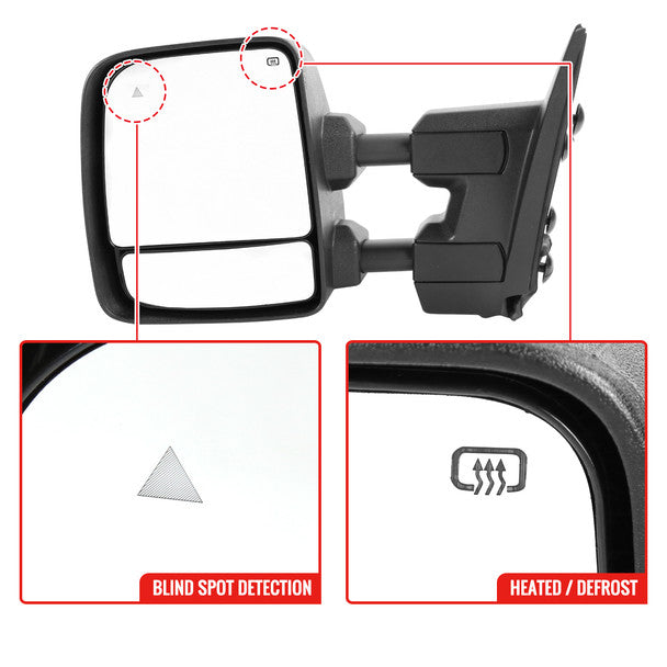 They are a direct bolt-on upgrade that keeps an OEM appearance while greatly enhancing rear and side visibility for safer lane changes, merging, and towing operations. They come in chrome or black housings.