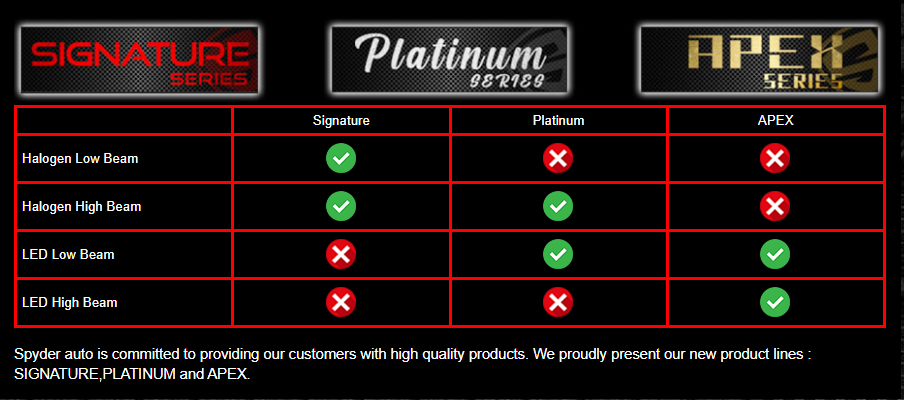 Spyder Auto is proud to present the Platinum Series line. We have added integrated LED bulb technology directly into our housings. The light emitting diode is also called a luminescence diode or, in short, LED. LED stands for "light emitting diode", as it turns electrical energy into light. Physically, it is a cold-light source and an electronic semiconductor component part in optoelectronics. Its conductivity lies between that of conductors (e.g. metals, water, graphite) and non-conducting materials (e.g. non-metals, glass, wood). Spyder Auto has taken existing housing as well as new designs and added LED bulbs to the Low beam and keeping halogen bulbs for the high beam to keep cost in mind.