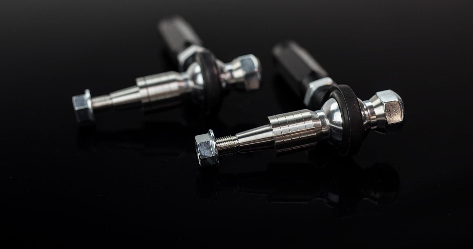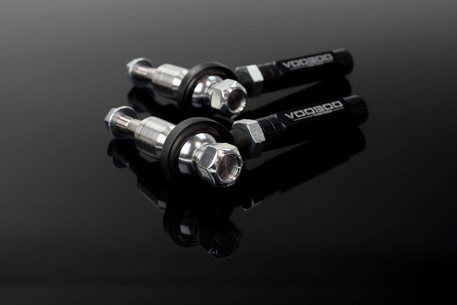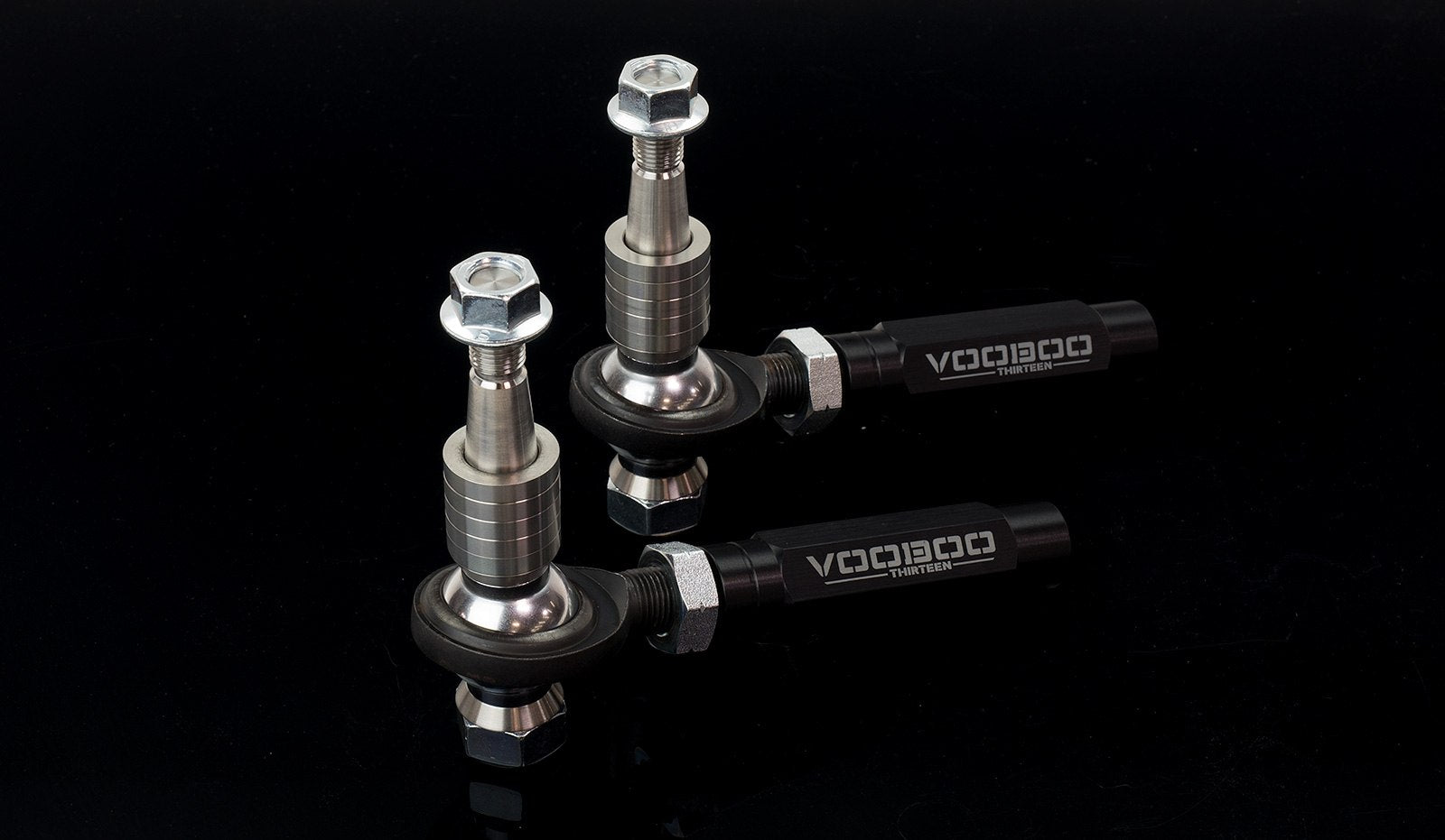 Voodoo13 G35 outer tie rods allow for adjustable bump steer correction. With an excessively lowered car, the changes in the suspension can cause unwanted handling characteristics such as bump steer. Roll center will also be effected negatively when lowering a car which can cause the car to roll more when cornering. Bump steer is when the driver’s input is absent when steering the front wheels, and it steers itself during road imperfections due to improper suspension geometry. With our adjustable tie rods, you can fine tune the suspension geometry using the included spacers to dial out bump steer as well as relocate the roll center closer to OEM position which also reduces the stress on the ball joints in the steering system. To ensure binding isn’t a problem, our outer tie rod ends incorporate QA1’s high misalignment rod ends with 64 ° of misalignment angle.