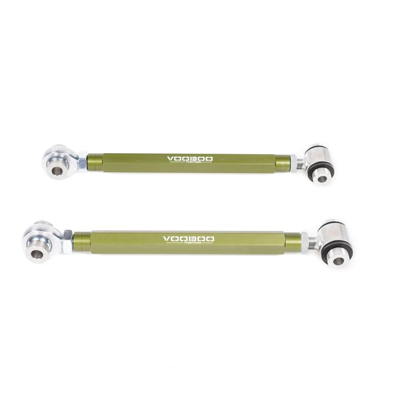 Voodoo13 Rear Toe Arms are engineered, manufactured, and assembled at our Mesa, Arizona facility using only the best materials from US suppliers. We precision CNC machine the adjusting rod from high strength 6061-T6 aluminum and then treat them in MIL-A-8625 Type III Hard Anodize. Our steel rod end is CNC manufactured with TIG welded construction. Grade 8 zinc coated hardware is used to protect against the elements. Stainless steel misalignment spacers are made in house to fit perfectly into the heim joints.