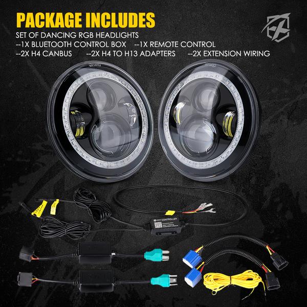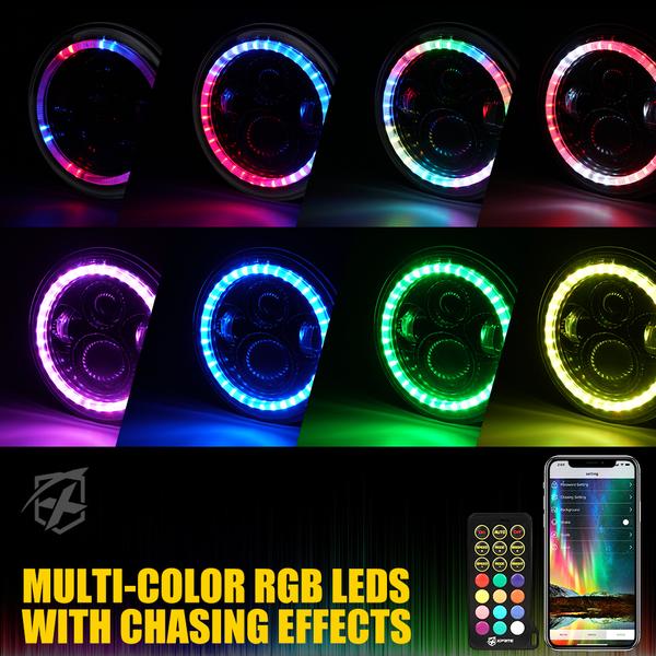One Pair of Xprite 7" 90W CREE LED Headlights with RGB Chasing Halo for 1997-2018 Jeep Wrangler