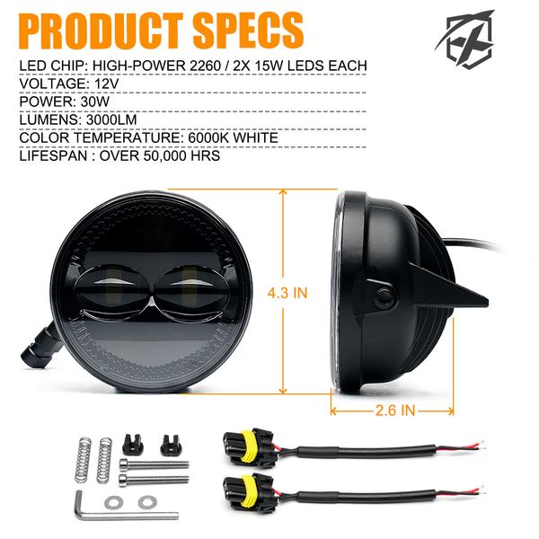 - Power: (2) 15W LEDs, 30W Total Each Light